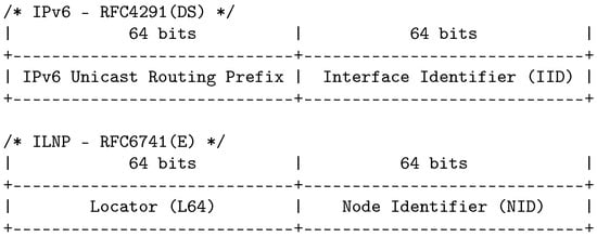 7] is a network-based solution to realise an identifier–locator split architecture using a routing approach, with direct support for multihoming. LISP defines an End-system Identifier (EID) as a name that acts as an identity for a host and a Routing Locator (RLOC), which acts as a network name for a host. In LISP, both EID values and RLOC values are each an IPv6 address (128 bits), i.e., the semantics of an IPv6 address are overloaded in the communication stack. There is work in progress to define a mobility function for LISP—