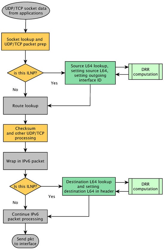 In order for ILNP to select a source L64 for multipath transport, the outgoing interface must correspond to the L64 selected by ILNP on a per-packet basis. However, the two distinct transport layer packet processing mechanisms select the outgoing interface at the early phase of their packet processing. This phase of packet processing had to be modified in order for ILNP to gain the ability to select the outgoing interface and the route such that the selected source L64 value would be reflected accordingly. The packet processing path involves a route lookup when the UDP and TCP packet headers are being constructed before they are passed onto the IP layer packet processing mechanisms. This is to ensure that the pseudo-header source address (and Checksum calculations) match the actual source address and the outgoing interface. In the context of a conventional IP, the actual source address and the respective outgoing interface do not change; therefore, they are cached after the initial lookup. However, that is not the case with ILNP, especially in the context of multihoming, where the packets in a flow may leave from different interfaces depending on the binding between local L64 values and interfaces.