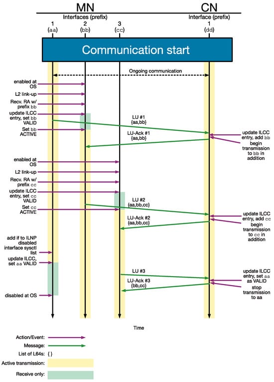 As for the ILNP evaluation, the MN moved from single connectivity to three-way connectivity gradually, then returned to single connectivity, and data from 20 runs were collected. This is in direct analogy to the procedure described for our measurements for TCP and UDP in