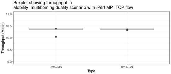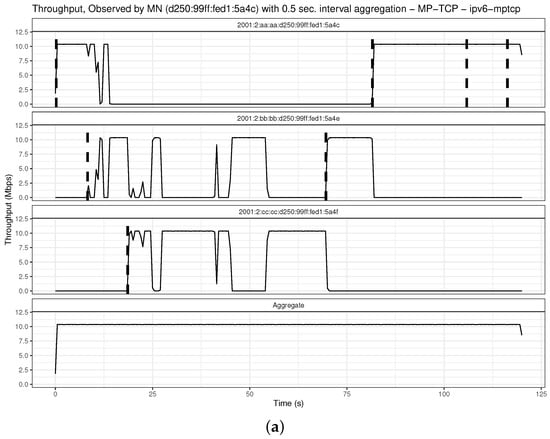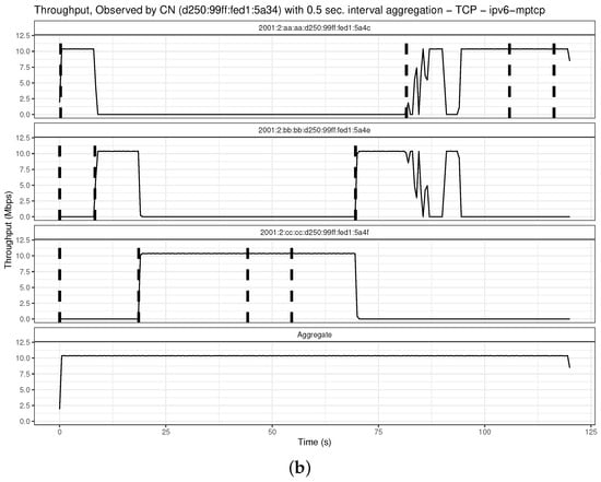 Figure 16a,b show the throughput values of a typical 120-second run as received at the MN and the CN for the MP-TCP. Clearly, the behaviour of the MP-TCP scheduler led to a ‘bursty’ traffic pattern across the network connections. Although the aggregate throughput is consistent, the ‘bursty’ behaviour of the transmission in MP-TCP could cause issues in the traffic management of the networks that the respective interfaces are connected to. Compare this to the smooth transitions with ILNP in