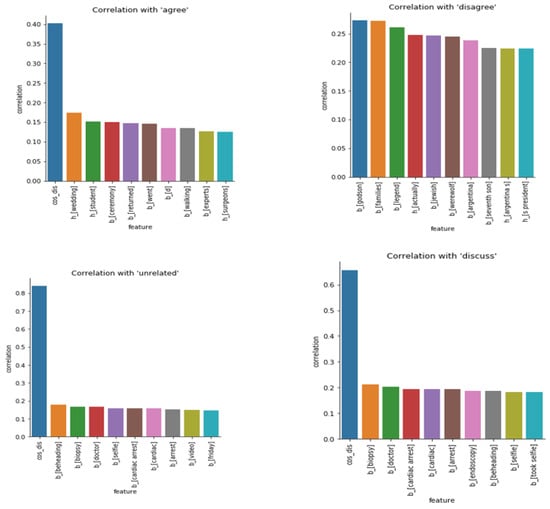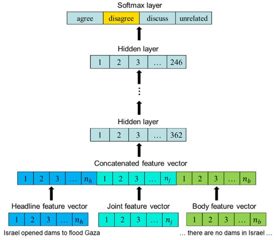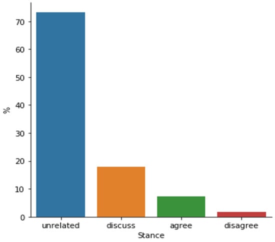 Stance detection has found applications across various fields, including the identification of fake news. Numerous researchers have focused on detecting fake news by examining the stance of texts, particularly when the stance is directed toward a specific topic or entity [13]. Fake News Challenge (FNC) involved the development of machine learning models that can predict stance labels given a headline and body of a news article. The stance label to be assigned could be one of the sets: ‘agree’, ‘disagree’, ‘discuss’, or ‘unrelated’. The provided dataset consists of pairs of a headline of a news article as a claim and a snippet of text related to the headline. Most of the teams participating in the FNC, including the winner team, used deep learning (DL) approaches to develop their learning and prediction models. Several papers discussed FNC and main submissions, such as [14,15,16,17,18,19]. Previous research indicates that traditional text processing methods have been effective. The crucial insight appears to be in comparing features from the headline with those from the body of the text. This approach is intuitive, as the stance is often determined by how the body of the text relates to the headline.