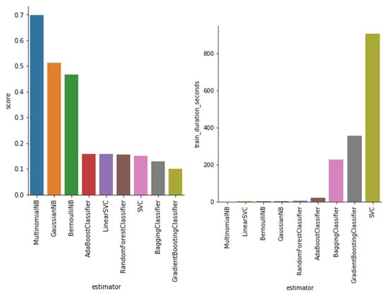 The training methods evaluated included support vector machine classifiers, naïve Bayes classifiers, and ensemble techniques such as random forest and gradient boosting classifiers. Scikit-learn facilitates model experimentation as all models implement a consistent set of methods. Figure 8 displays the performance scores and training times for nine classifiers used in the initial stage of our multi-stage models. The performance score represents the percentage of correctly predicted targets.