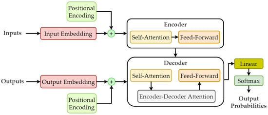 LLMs are advanced artificial neural networks that employ the transformer architecture, a revolutionary development in deep learning. Originally introduced in [78], the transformer model uses an encoder–decoder structure designed to handle sequence-to-sequence tasks efficiently. The transformer model architecture is shown in Figure 2. The encoder processes the input sequence, capturing relevant information, while the decoder generates the output sequence by attending to the output of the encoder and previously generated tokens. This dual structure enables the transformer to excel in NLP tasks, where understanding and generating sequences of text are critical. The mathematical foundation of this architecture involves self-attention mechanisms, which allow the model to dynamically weigh the importance of different words in a sentence. The encoder–decoder structure works by first passing the input sequence through the encoder layers, which consist of multi-head self-attention and feed-forward neural networks. The self-attention mechanism can be mathematically represented as follows: