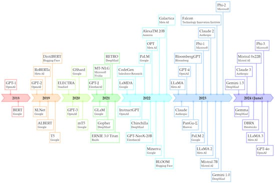 The timeline of the development of LLMs from 2018 to 2024 (June), showcasing key advancements and notable models.