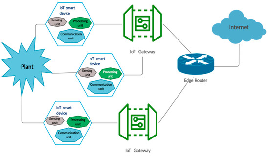 An illustrative diagram of a typical IoT ecosystem is given in Figure 2, presenting the components commonly found in an IoT system. The plant represents the physical environment that is to be monitored, such as agriculture fields, manufacturing plants, power grid generators, home appliances, and human beings [54]. The IoT devices that are generally deployed near the plant can be classified as IoT end devices or IoT gateways. IoT end devices host the sensors, processing unit, and a low-powered communication module [55]. Whereas the IoT gateways, depicted as hubs, act as aggregators for the data generated by the IoT sensors and also provide the first level of data connectivity between the sensing nodes and the rest of the network [56]. Both IoT end devices and IoT gateways are generally known to be resource-constrained devices within the IoT ecosystem as opposed to the conventional IT networks in which such devices are known to have abundant amounts of resources [57].