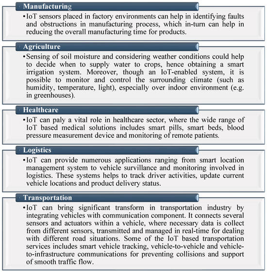 IoT is building a worldwide infrastructure that will influence all facets of our lives, including agriculture, mining, health services, manufacturing energy production, energy distribution, and transportation. The rate of IoT devices is increasing rapidly, encompassing multiple domains including home appliances, healthcare, and transportation [58]. IoT is one of the fastest-growing technologies and is employed in many areas to facilitate the needs of consumer and industrial networks [59]. Selected application domains of IoT are presented and discussed in Figure 3, which includes healthcare, manufacturing, logistics, and agriculture and transportation domains. Other popular domains include environment monitoring control and management, reducing loss of electricity in the energy sector, and defense.