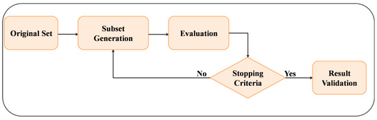 Feature selection is a preprocessing optimization technique used to elect a subset of significant features by evacuating insignificant and excess features from the dataset for building an effective learning model [71]. Generally, each classifier is trained on a given dataset; hence, a dataset with a large number of features consequently requires more training and testing time, along with a considerable amount of computing resources. In addition, not all features within a dataset are necessarily relevant to attack detection for the devised classification model [72]. To address the above highlighted problems, feature selection methods are utilized before the application of ML algorithms, which helps in reducing the computation time and obtains more accurate results [73,74]. Typically, the feature selection procedure generally consists of four steps, as shown in Figure 4. At the start, a subset generated from the original dataset is assessed by using the evaluation function, which calculates the goodness of the generated subset. Furthermore, the evaluated goodness is fed to the next phase, where stopping criteria decide whether to validate or invalidate the subset [75]. The feature selection algorithms have been classified into three categories as follows: Wrapper, Filter, and Embedded methods [76].