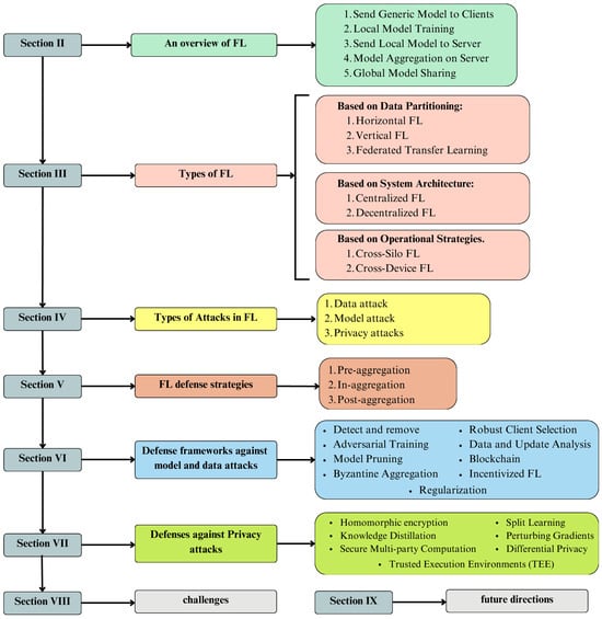 The remainder of this paper is organized as follows and is presented Figure 1: Section 2 provides an overview of FL. Section 3 discusses the different types of FL. Section 4 offers a comprehensive overview of the various attacks that can target FL systems, categorizing them into data, model, and privacy attacks. Section 5 explores the defense strategies to mitigate these attacks, with an in-depth look at pre-aggregation, in-aggregation, and post-aggregation defenses. Section 6 presents the defense frameworks against model and data attacks, while Section 7 focuses on the privacy frameworks. Section 8 discusses the challenges, Section 9 outlines the future directions, and Section 11 concludes the paper.