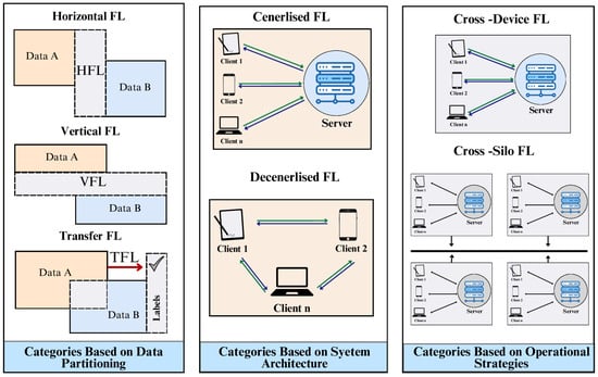 Various types of FL exist, each suited for different applications and scenarios. This document outlines the primary types of FL, categorized by data partitioning, system architecture, and operational strategies, as depicted in Figure 3.