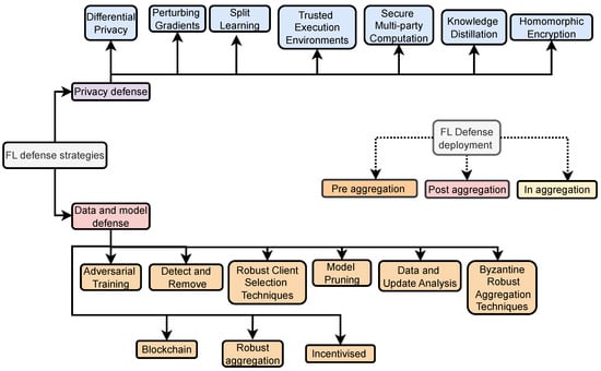 To counter the emerging threats FL, researchers have proposed a variety of defensive strategies [72,73,74]. These defense mechanisms address adversarial attacks across distinct phases of the learning process: pre-aggregation, in-aggregation, and post-aggregation. Pre-aggregation defenses [72,73,75] focus on early identification and mitigation of malicious updates before they impact the global model. In-aggregation defense techniques [64,74,76,77,78] employ robust aggregation operators to mitigate adversarial effects during the global model update phase. Conversely, post-aggregation defense strategies [79,80,81] concentrate on repairing adversarial models after completing the FL training process, ensuring the final model’s integrity. These phase-specific defense mechanisms are crucial for enhancing the security and reliability of FL systems against backdoor attacks. The two main categories of defenses based on attack types are data and model defense, and privacy defense. These defense frameworks can be further categorized based on their working principles, as depicted in Figure 5.