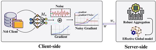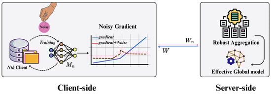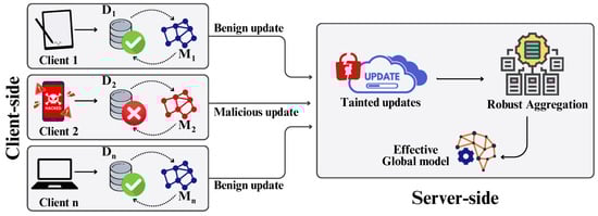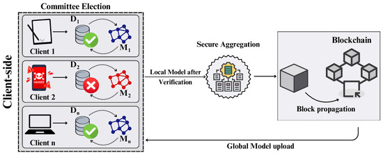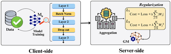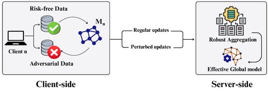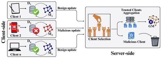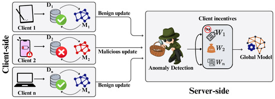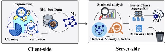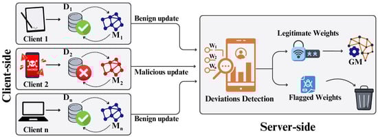 This method is typically implemented on the server side and focuses on detecting and removing malicious updates to the model. It involves continuously monitoring incoming updates from clients and analyzing them for any signs of abnormality or inconsistency. Suspicious updates that do not conform to the expected pattern of legitimate updates are flagged. These deviations might be detected through statistical analysis, machine-learning-based anomaly detection, or by comparing the updates against a baseline of known good updates. Once identified, these flagged updates are removed from the aggregation process to prevent them from negatively impacting the model’s performance, thereby ensuring the integrity and reliability of the FL system. The block diagram of the detect and remove method is presented in Figure 6.