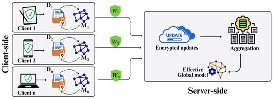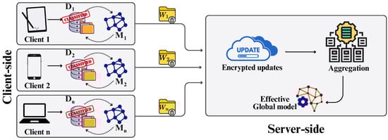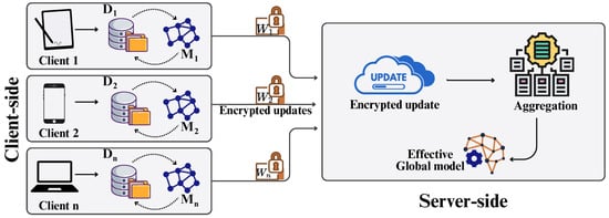 In response to these security challenges, alternative paradigms like FL have gained traction [15]. FL decentralizes data processing and model training, thereby distributing the risk associated with data breaches across multiple devices [16,17]. By keeping data local to where they are generated, FL mitigates the exposure of sensitive information during transmission and storage [18]. This decentralized approach not only enhances data security but also reduces the potential impact of security breaches, offering a more resilient framework for machine learning in IoT and other data-intensive applications [19,20].