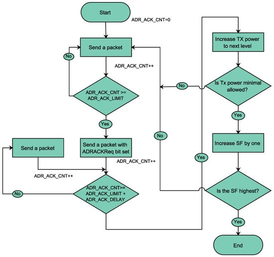 The LoRaWAN standard employs an integral feature known as the Adaptive Data Rate, which serves multiple essential purposes. The ADR is designed to prolong the battery life of EDs, optimise quality of service requirements, enhance overall network capacity, and maximise data throughput. The achievement of these objectives relies on the dynamic management of the spreading factor and transmission power. The study [30] presents a synopsis of the LoRaWAN ADR framework. The ADR algorithm operates at both the end node and network server sides. EDs play a role in determining whether ADR should be activated by setting a specific bit. Once this bit is set, the NS takes charge of regulating the transmission settings and issuing the necessary ADR commands to the ED. Periodically, the ED verifies whether the network server is successfully receiving uplink packets, which is confirmed through SNR link margin feedback sent by the NS. In cases where uplink transmissions fail to reach the gateway, the primary objective of the ED is to improve the status quo by incrementing the spreading factor, hence decreasing the data rate. Additionally, if a downlink packet is not confirmed within a programmable measurement of packets, the ED takes proactive action by increasing the SF for the ensuing uplink packet [15]. This results in an improvement in the transmission range and the possibility of communicating with the GW. The specified procedure followed to adjust to optimal SF is shown in Figure 1. By dynamically adjusting these transmission parameters, LoRaWAN’s ADR effectively adapts to varying environmental conditions, ensuring optimised performance and efficient resource utilisation in the network.
