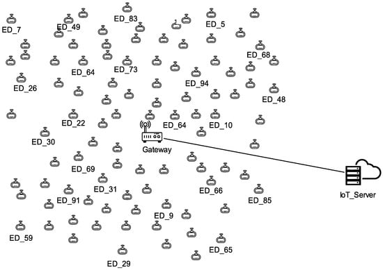 The network is partitioned into K regions wherein K represents the number of available spreading factors. The simulations are conducted using an ns-3 simulator [49] using a LoRaWAN module developed by [50]. The simulation is carried out with a fixed number of EDs and it is assumed that their number does not change during the simulation. Figure 2 shows a NetAnim output of the LoRaWAN network scenario implementing 100 EDs. The simulation settings are presented in Table 3. A four-state energy consumption model is assumed, comprising the transmit, idle, receive, and sleep states. Table 4 shows how the energy model links the voltage and current usage to each state. To compute network energy usage, we track each node’s energy usage during simulation. Semtech produced these parameters for the SX1272 LoRa transceiver used in this work for transmit power 10 dBm [51]. These parameters are employed in conjunction with Table 1. The model estimates ED battery life and energy consumption. Total energy consumption for each ED is given by: