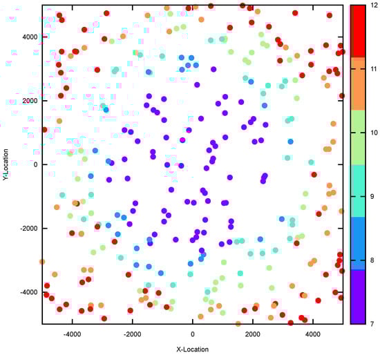 The network topology with 300 EDs and its corresponding SF distribution is visualised in Figure 3, showcasing the differentiated SF allocations achieved by Algorithm 1. By incorporating these techniques, the proposed SSFIR-ADR algorithm demonstrates its ability to effectively reduce energy consumption and mitigate interference while maintaining satisfactory packet delivery performance in LoRaWAN networks.