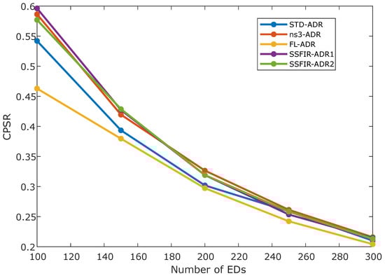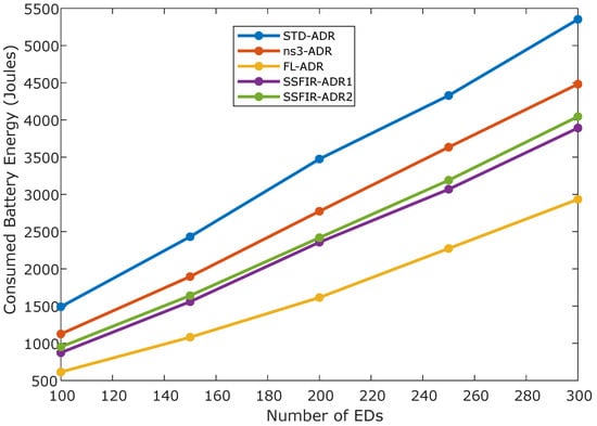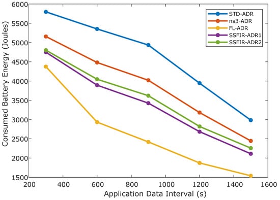 The proposed SSFIR-ADR model exhibits a notable decrease in the global energy utilisation of the network, as illustrated in Figure 4 when considering different application data intervals, and Figure 5 when examining various node densities. When comparing SSFIR-ADR1 and SSFIR-ADR2 against the standard ADR algorithm, both variants demonstrate average energy savings of 27% and 24%, respectively. It is vital to take note that the energy consumption of the ADR algorithm directly correlates with the network size, as depicted in Figure 5. Consequently, as the application data interval increases, the energy consumption decreases for a fixed number of end devices within the network. This improvement in energy efficiency can be attributed to the reduction in interference, leading to fewer collisions and subsequently fewer retransmissions. By minimising these disruptions, the proposed algorithm effectively conserves energy resources. As a result, the proposed SSFIR-ADR algorithm presents superior performance in comparison with the ns3-ADR protocol, although it is outperformed by the FL-ADR scheme in terms of saving energy.