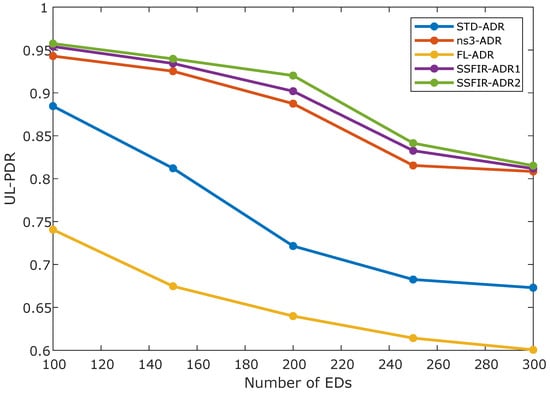 Figure 6 and Figure 7 illustrate how the proposed SSFIR-ADR1 and SSFIR-ADR2 algorithms perform in terms of the uplink packet delivery ratio. Both variants of SSFIR-ADR exhibit improved UL-PDR compared to other algorithms. The primary objective of the proposed ADR algorithm is to reduce energy utilisation while preserving a high packet delivery ratio by mitigating interference and optimising data rates for end devices. However, due to the limited transmission parameters that can be adjusted by ADR in LoRaWAN, complete elimination of collisions is not feasible. As network density increases, the potential number of interferers during each transmission also rises. In this scenario, the proposed ADR algorithm surpasses all the algorithms used for comparison, highlighting its effectiveness in reducing collisions. For instance, at a network density of 200 EDs and an application data interval of 600 s, the standard ADR algorithm achieves a PDR of 0.72, the ns3-ADR algorithm achieves 0.88, the FL-ADR scheme achieves 0.64, SSFIR-ADR1 achieves 0.90, and SSFIR-ADR2 achieves 0.92. These results indicate an approximate improvement of 18% and 20% in UL-PDR compared to the standard ADR algorithm for SSFIR-ADR1 and SSFIR-ADR2, respectively. While FL-ADR outperforms SSFIR-ADR with reference to energy consumption, it falls short in achieving a comparable packet delivery ratio. This result showcases the balance between energy consumption optimisation and PDR performance.
