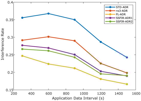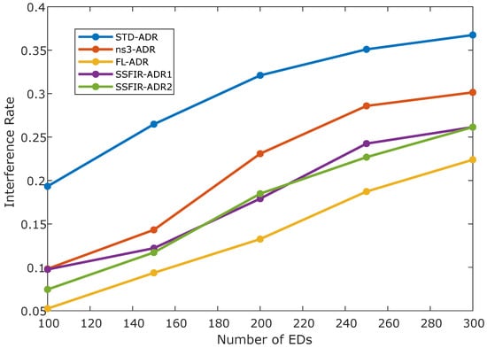 The interference or collision rate, which represents the ratio of total received packets to packets lost due to interference, serves as a measure of network performance. In Figure 10 and Figure 11, we examine the performance of several LoRaWAN ADR implementations relating to the interference ratio. The proposed SSFIR-ADR algorithm consistently demonstrates a lower interference ratio across different application data intervals and node densities except for FL-ADR. It is worth noting that longer application data intervals generally exhibit lower interference ratios compared to faster data intervals. Both graphs in Figure 10 and Figure 11 illustrate the effectiveness of the proposed SSFIR-ADR models in reducing interference ratios across all scenarios. For instance, in Figure 11, the standard ADR algorithm shows an interference rate ranging from 0.19 to 0.36 for this network with up to 300 EDs. In contrast, SSFIR-ADR2 exhibits an interference rate between 0.07 and 0.26, while SSFIR-ADR1 ranges from 0.09 to 0.26. The stochastic approach employed in our proposed model for optimising spreading factor allocation contributes to a reduction of over 20% in the interference rate in comparison with the standard ADR algorithm and 14% improvement in comparison with the ns3-ADR algorithm. However, the FL-ADR algorithm outperforms the SSFIR-ADR models by approximately 12% in terms of interference reduction. Overall, the results establish the efficacy of the proposed SSFIR-ADR models in mitigating interference and improving network performance.