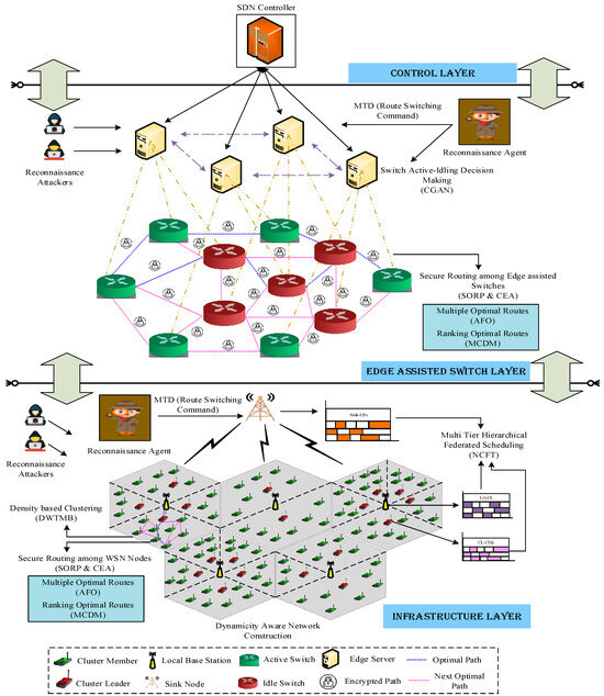 The main entities involved in this work are WSN nodes, local gateway (LG), sink node, reconnaissance monitoring agent, edge-assisted SDN switches, and SDN controller. There are three layers involved in this work: the infrastructure layer, the edge-assisted switch layer, and the control layer. To ensure the network intelligence and accuracy, this work also utilizes Artificial Intelligence (AI) technology. Figure 1 represents the overall proposed system model.