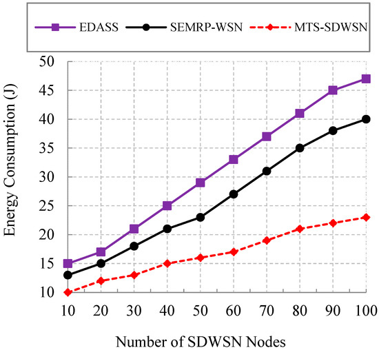 The quantitative analysis from the graph shows that the proposed MTS-SDWSN gains energy consumption of 23 J when the number of SDWSN nodes reaches 100, whereas for the same SDWSN nodes the energy consumption rate of SEMRP-WSN and EDASS gains with 40 J and 47 J, respectively, which is 17 J–24 J higher than our proposed model.