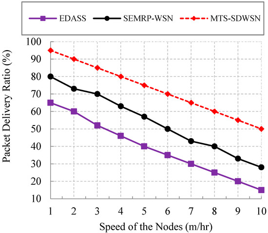 The quantitative analysis from the graph shows that the proposed MTS-SDWSN gains higher PDR of 50% when the speed of SDWSN nodes reaches 10 m/h, whereas for the same speed of nodes the PDR rate of SEMRP-WSN and EDASS gains with 28% and 15%, respectively, which is 22–35% less than our proposed model.