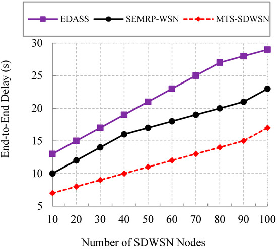 The quantitative analysis from the graph shows that the proposed MTS-SDWSN gains less E2E of 17 s when the SDWSN nodes reach 100, whereas for the same SDWSN nodes the E2E rate of SEMRP-WSN and EDASS gains with 23 s and 29 s, respectively, which is 6 s–12 s more than our proposed model.