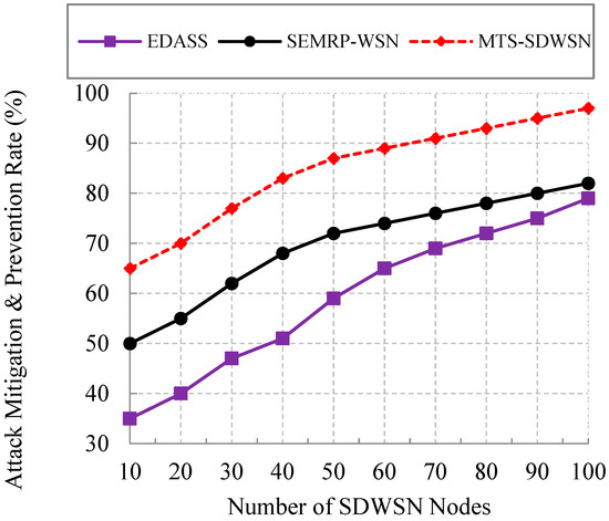 The quantitative analysis from the graph shows that the proposed MTS-SDWSN has a higher attack mitigation and prevention rate of 97% when the SDWSN nodes reach 100, whereas for the same SDWSN nodes the attack mitigation and prevention rate of SEMRP-WSN and EDASS gains with 82% and 79%, respectively, which is 15–18% less than our proposed model.