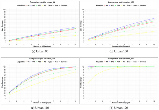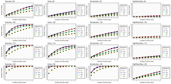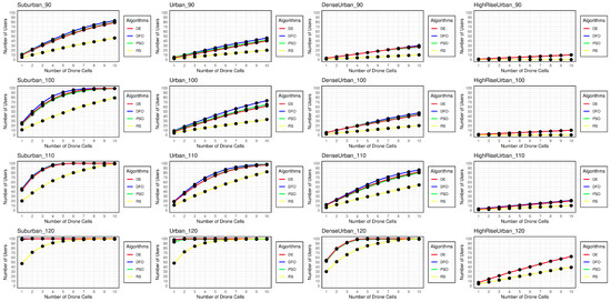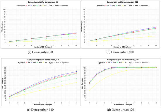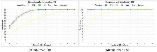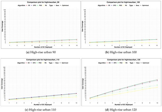 - Environment: Environments such as suburban and urban are considered as easy environment since there are a limited number of factors obstructing LoS, while environments such as high-rise urban and dense urban are considered as hard environments where multiple artificial structures can easily obstruct LoS, with high-rise urban being considered the hardest of all the given environments. As the environment changes from easy to difficult, the coverage radius also starts decreasing, leading to less user coverage as can be seen from Figure 7, Figure 8, Figure 9 and Figure 10. Among all the environments, high-rise urban has had the least improvement in user coverage. In Figure 10a–d, there is little to no change in user coverage, and it can be considered that given the constraints and environment, there can be no better solution that can be found in that particular scenario. Dense urban, while still being a challenging environment, has had some improvement in coverage radius in all scenarios.