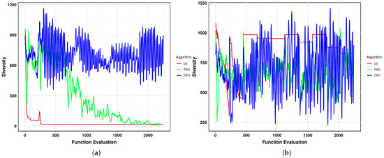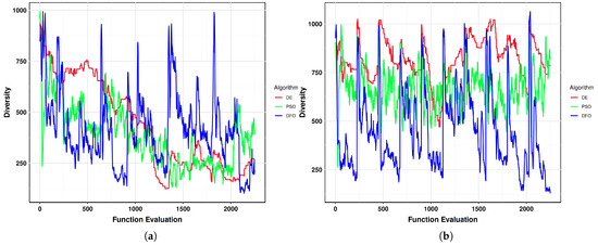 Plotting the diversity again using the phased restart strategy in Figure 3b and Figure 4b shows that the diversities of all algorithms are comparable throughout the process, only becoming low at the end of each segment where the probable best solution has been found. It is to be noted that DFO inherently does not require a phased restart, but it has been implemented in DFO as well to make sure that all the algorithms are on par with each other.