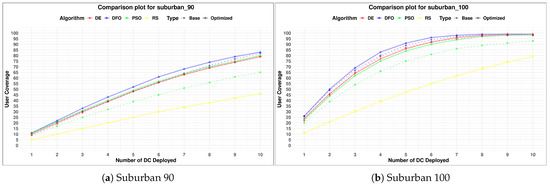 Figure 7, Figure 8, Figure 9 and Figure 10 visualize the difference between the coverage probability of the implemented algorithm for the default and tuned parameter values. DFO, due to the restart mechanic with higher diversity, has the least improvement in user coverage probability. However, with DFO’s advantage in diversity from the disturbance threshold, the coverage probabilities of DFO and DE are very similar in all instances. The DC placement problem on its own, although being a complex problem, can be converted to a simpler one when broken down into multiple sub-parts. In the case of the problem presented in this paper, its complexity has been minimized. It is hypothesized that for DE implementation with its 250 FEs per segment, the search agents are not converging fast enough to the local minima and the scattered agents are leading to its higher diversity, while PSO converges faster, initially leading to its less than optimal user coverage. Given increased FEs or iterations, DE will converge to the local minima, leading to less than optimal coverage. Any additional constraints or changes in the parameter tuning process for finding the user coverage could affect the algorithms’ performance.