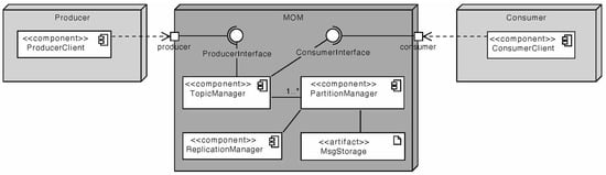 The term Message-Oriented Middleware (MOM) is used to describe a software and/or hardware infrastructure used to send and receive messages between distributed systems and to provide storage (persistence) for those messages. The MOM decouples application components, so that they can use different operating systems and network protocols [,]. An important feature of modern MOM implementations, such as Apache Kafka, is that they provide persistent storage and mechanisms to organize messages, guarantee message queue properties (such as immutability, authenticity or ordering), balance the load between MOM servers, etc.