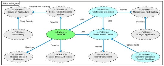 The patterns in blue in Figure 2 represent patterns that are part of our pattern language, with the SARMOM pattern highlighted in green. The rest of the patterns in gray are related patterns from other authors. The SARMOM pattern is based on Message-oriented Middleware [], Event-Driven Architecture [] and Secure Distributed Publish/Subscribe pattern for IoT [], which, in turn, is related to Secure IoT Architecture and Secure IoT Thing []. SARMOM differs from Secure Distributed Publish/Subscribe pattern for IoT in several aspects. In particular, the former follows a strictly pull-based approach, while the latter can use a push-based strategy for messages, which was not convenient in our case. Additionally, SARMOM is tailored for auditability and includes mechanisms to ensure the immutability and ordering of the message chain. Moreover, Secure Distributed Publish/Subscribe pattern for IoT involves the use of Secure Channel, Authenticator, Signer, Encryptor, Decryptor and Signature Verifier patterns, which are not necessary in SARMOM. In particular, the authentication and access control functions are externalized in SARMOM. We rely on the Shared Access Control pattern, which, in turn, is a specialization of Shared Component and complements Minimize Component Security Functions, by outsourcing the access control functionalities, thus minimizing the security functions that are incorporated in SARMOM.