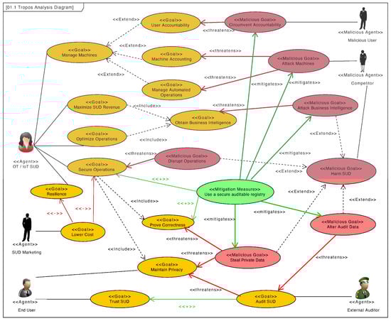 The OT/IoT SUD agent represents the legitimate stakeholders of the SUD in general, who need to manage machines in their SUD, and who are also interested in goals such as obtaining SUD intelligence to maximize SUD efficiency and to optimize operations. Guaranteeing operations and the resilience of the SUD are also important goals that may be negatively affected by the marketing goal of lowering the cost of the system. Privacy is a goal of the SUD stakeholders but also of the end users. Another goal of the end users is to gain trust in the SUD, which is positively influenced by the goal of external auditors (representing authorities and regulatory boards) to audit the SUD. It is important to note that this legitimate goal of auditing the SUD can represent a threat to privacy. Likewise, it is important to note that some agents may act selfishly or dishonestly.