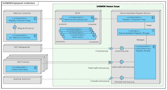 Having different SUD Functions with different capabilities may require setting up access control mechanisms, at least for these interfaces, ideally using an external access control service (hence the suggestion to use a shared access control pattern). This access control component is not shown in the diagram because it is not strictly necessary for SARMOM, because its implementation is very dependent on different criteria and because it is covered by external patterns. The materialization of the Secure Auditable Registry (SAR) component as a service allows the target SUD to reduce coupling and facilitates the development of new functions, as they all will use the registry as the main source of data.
