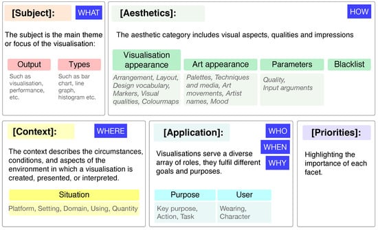 Second, the [aesthetics] and structure of the visualisation are crucial. We add four sub-categories: visualisation appearance, art appearance, parameters, and blacklist. Each help to define the aesthetic appeal and appearance of the work. In visualisation, designers will use techniques from, e.g., Bertin [75] to exchange the data variables with visual variables. This involves carefully mapping the data to appropriate retinal variables, such as the position, colour, size, shape, or texture to ensure the information is both clear and impactful. How these visual elements are organised greatly influences how the data are understood. We define these as visualisation appearance terms. Visualisations can adopt various layouts—such as circular, linear, hierarchical, grid-based, or more complex non-linear formats—based on the nature of the data and the intended message. As a result, we define tertiary categories like arrangement, layout, design vocabulary, and more, see Figure 2. The choice of arrangement should enhance readability and highlight relationships or patterns in the data, helping users to grasp key insights more effectively. In addition to the visualisation appearance, we can define aesthetics in terms of general art appearance. In traditional prompt engineering for image generation, users often employ a variety of artistic descriptive terms. These can influence the colour palette, art techniques, and media appearance; reference specific art movements (such as pointillism or others); evoke the style of a particular artist (e.g., Picasso); or convey the mood of the piece (which we categorise as tertiary terms). Parameters also shape the visual appearance by specifying attributes such as the quality (e.g., resolution and aspect ratio) or other factors (e.g., format and rendering style). Finally, we can specify what should be excluded by blacklisting certain aesthetic terms.