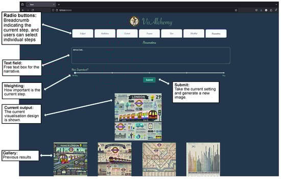 The user interface of VisAlchemy (see Figure 3) is designed to guide users through the visualisation generation. With a focus on simplicity and clarity, the UI provides a straightforward method that prompts individuals to add the next statement before generating the visualisations. The breadcrumb interface at the top of the form displays the current step and allows users to navigate between sections and move between steps. Completed steps are indicated by a checkmark, providing clear visibility of the user’s progress. Users can move between sections using the back and next buttons. Additionally, they can click on the stepper numbers at the top to jump to specific steps, offering flexibility in navigation. To accommodate varying user preferences and avoid imposing restrictions, we do not adapt the strings or restrict the wording in any way. Prompts can be left blank. The power of the approach is to lead people through the narrative structure; individual prompts can be easily weighted differently, the weights can be easily altered (and the prompt run again), and any stage can be exchanged for new text to run a subset of the intended prompt.