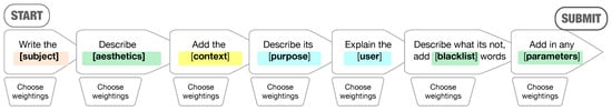 The architecture of VisAlchemy leverages Django for its back-end operations and JavaScript for its front-end interactions. Leveraging JavaScript’s extensive library and framework ecosystem streamlined the development process and quickly integrated complex features with less coding effort. JavaScript is used to construct a JSON object that encapsulates seven distinct stages: subject, aesthetics, situation, purpose, user, blacklist, and parameters. We concatenate the user-defined phrases along with articles (such as “the”, “a”, and “an”), prepositions (such as “in”, “on”, and “at”), conjunctions (such as “and”, “but”, and “or”), and pronouns (for the user). These words help to structure sentences, convey relationships between elements, and ensure grammatical correctness, but they do not carry significant semantic content on their own. These stages and their associated weightings form the foundation of the system’s functionality. The weightings are designated as follows: