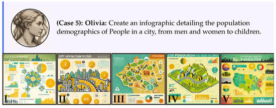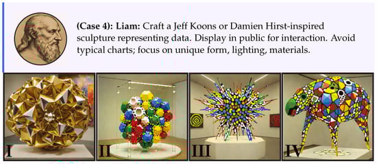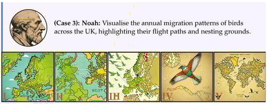 Designers of data visualisation solutions place emphasis on comprehending the data, carefully mapping key components to visual variables, and the presentation of information within its relevant context. For instance, Jacques Bertin [75] identified seven “visual variables” that are fundamental to designing effective visual representations of data; position (xy), size, shape, value, colour hue, orientation, and texture. These variables help convey the structure of the data and are the building blocks of information graphics, such as maps, charts, and graphs. They enable designers to create alternative designs, where a numerical value can be presented by position from a common scale, or mapped to a colour, or alternatively mapped to size. Bertin advocated for rearrangement, emphasizing that modifying the arrangement of data—such as reorganizing rows and columns in tables or matrices—can uncover patterns that may not be apparent in the raw data. He also highlighted visual rearrangement, which involves changing the implantation (point, line, area, and 3D) or altering its arrangement (linear, circular, hierarchical, and grid). Bertin also identified various design types. He emphasised maps (any representation where locations correspond to real-world geographic meanings), networks (connected visualisations like graphs or trees, such as the London Underground map), diagrams (schematised sequences of steps), and symbols. Consequently, when designing visualisations, we can instruct the AI to not only render the image in a particular art style but to concentrate on elements like a network graph or geographic map. Alternatively, we can incorporate specific types of visualisations, such as bar charts, line graphs, pie charts, and others. Work from other visual designers can be also added. For instance, both John Tukey and Eduard Tufte [76] emphasise simplicity, with Tufte suggesting that chartjunk and other unnecessary decorative elements should be removed. Shneiderman, in his Genex framework (Collect, Relate, Create, Donate), emphasises experimentation to discover new solutions. Rosling [77] was well known for his interactive presentations aimed at challenging misconceptions, frequently utilising real-world examples and physical objects to convey his message.