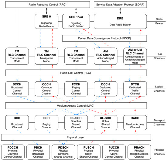 Digital mobile networks enable wireless, location-independent communication and data transfer between mobile devices, called user equipment (UE). The basic architecture consists of an access network and a core network. The so-called radio access network (RAN) interconnects several base stations, called gNodeBs (gNBs), that provide a radio interface for local signal transmission. The core network, on the other hand, is responsible for mobility management and acts as the central gateway for internal and external data transfer. The communication between the UE and the core network is divided into two planes: the user plane (UP) carries the user data traffic, while the control plane (CP) is used for signaling and control data. The wireless communication between gNBs and UE is performed over the air interface, called 5G New Radio, which comprises a protocol stack that implements OSI layers one to three. From a logical perspective, each protocol processes the data of the next higher and lower layers and transmits them over a logical communication link to the next responsible protocol layer. Figure 1 visualizes the complete 5G New Radio stack with all protocol layers and the channels between them. The mapping between the channels and protocols [3,7] is shown for both the uplink (red) and downlink directions (blue).