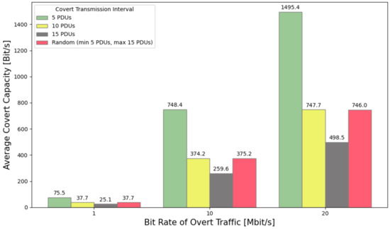 The experimental implementation of our proposed hiding method was initially evaluated in a test environment that simulated a real 5G network. The test setup consisted of virtualized open source software components and a simulated radio interface based on the networking library ZeroMQ. Open5GS was deployed as the 5G Core, and the gNB from srsRAN Project was used as the 5G RAN. The UE was simulated with the srsUE from srsRAN 4G. For the experimental tests, the covert sender was located in the gNodeB and the covert receiver in the UE. The overt traffic stream was generated with iperf. For different bandwidths as well as different intervals of the covert transmission, the covert capacity was evaluated (cf. Figure 3). Additionally, these tests were conducted with a real radio interface. The basic test setup was not changed. Only the virtualized radio interface was replaced with a physical radio interface provided through software-defined radios. For the evaluation of the proposed covert channel, two USRP B210s were used in the test environment.