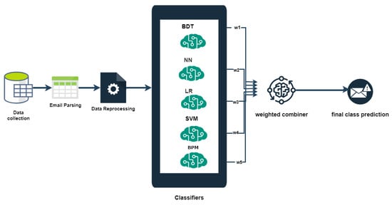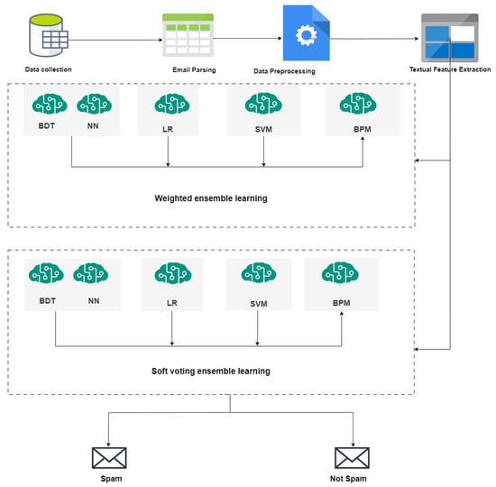The core element of the proposed methodology is the ensemble classification phase, as illustrated in Figure 1. This phase specifically entails the binary classification of electronic mail samples to determine their categorization as unsolicited messages. The primary aim of the phase of ensemble classification is to effectively combine characteristics to improve the classification performance the proposed approach. To accomplish this, the approach relies on the use of ensemble learning as opposed to a single classifier. Ensemble learning is a technique that integrates the outcomes of multiple algorithms of machine learning, referred to as base learners, to generate a prediction accuracy that is more consistent, robust, and precise in comparison to individual base learners. The course of action of ensemble learning entails post-processing of the outcomes of the prediction of base learners to obtain the final prediction of categorization. To enhance the effectiveness of the proposed approach, two well-established techniques of ensemble learning, specifically weighted ensemble learning (Method 1) and soft voting ensemble learning (Method 2), were employed. These techniques were chosen based on their proficiency in handling various types of algorithms of machine learning and allowing the independent processing of hybrid characteristics through the use of distinct algorithms of machine learning. For instance, one algorithm can be utilized for the processing of characteristics based on content, while another algorithm can be employed for the processing of characteristics based on text. The primary distinction between Method 1 and Method 2 lies in their respective approaches to combining the outcomes of base learners and determining the outcome of classification.