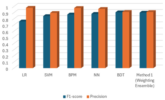 As we can see in Figure 8, method 1 demonstrates an F1-score of 0.9, a value that is competitive and close to that of the best-performing individual classifier (BDT, which exhibits an F1-score of 0.905). This observation suggests that the ensemble method efficiently captures both precision and recall, thereby achieving a favorable equilibrium between false positives and false negatives. The precision of Method 1 (0.91) is marginally lower than some individual classifiers, such as BPM (0.975) and NN (0.96). Nevertheless, the disparity is not significant, and the ensemble approach still maintains a high level of precision. Method 1 harnesses the power of an ensemble of classifiers, thereby potentially minimizing overfitting and effectively capturing diverse patterns within the data. Consequently, it tends to possess greater robustness and generalizability when confronted with unseen examples, contributing to its efficacy in detecting instances of phishing. The significance of higher precision or recall may vary depending on the specific requirements. Method 1 appears to strike a commendable balance between the two performance measures.