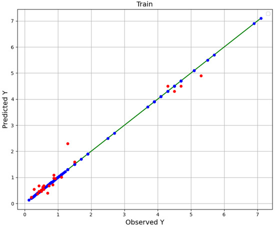 Figure 3 visually illustrates the alignment between predicted and actual values for the BONE dataset using the SBNNR method. In this figure, red points represent predictions on the test dataset, while blue points show predictions on the training dataset. The green line marks the actual values, providing a benchmark for comparison. Both the red and blue points closely cluster around this line, indicating that SBNNR can effectively capture the dataset’s underlying trends and generalize well across unseen data without overfitting. This close alignment is consistent with the high score and low error rates reported in Table 4 and Table 5, suggesting that the model successfully balances accuracy with generalizability.