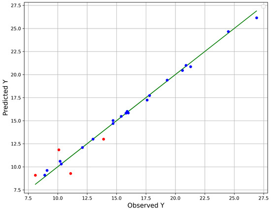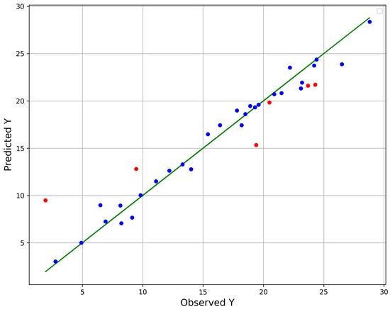 Similarly, Figure 4 depicts the alignment of predicted versus actual values for the FAT dataset under the SBNNR method. The red and blue points remain closely grouped around the green line, showing that SBNNR consistently predicts values that adhere closely to the true data trends. This clustering of predicted values near the actual value line reflects the method’s robustness, affirming its suitability for small-data regression tasks by effectively preventing excessive variance in predictions. Together with the observed low error rates and high score, this alignment indicates that SBNNR can manage data limitations without compromising on accuracy.