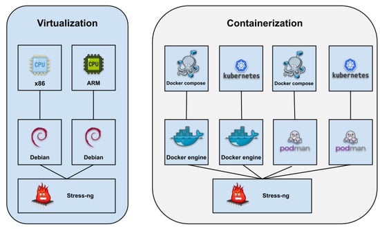 - Kubernetes and Docker: The Kubernetes test environment was set up as a single-node Kubernetes cluster using the minikube Kubernetes stack, the Podman container runtime and a single 64-bit Debian 12 container for running the tests. The docker test environment was set up as a 64-bit linuxserver debian 12 ssh container with stress-ng installed on the standard docker engine with Docker Compose orchestration.