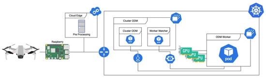 After obtaining the transformation matrix, the Raspberry Pi extracts metadata from the images to apply vignetting corrections. It then aligns the images using the transformation matrix, ensuring consistency across all spectral bands. Once the images are preprocessed and aligned, the Raspberry Pi sends them to the Cloud environment for further processing. In the Cloud, Kubernetes orchestrates the deployment of ODM instances within Docker containers. Each instance is responsible for processing a specific spectral index, such as the NDVI, or band.