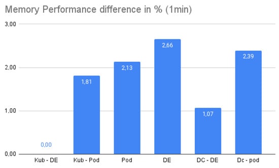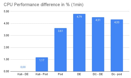 From the previous analysis, we found that the worst option was the use of the Kubernetes and Docker Engine stack, which in the different comparison test figures, with results given as percentages (Figure 3, Figure 4, Figure 5, Figure 6 and Figure 7), is the reference baseline, as it underwent no improvement in performance. Our purpose here is to check this option for a use case with intensive processing.