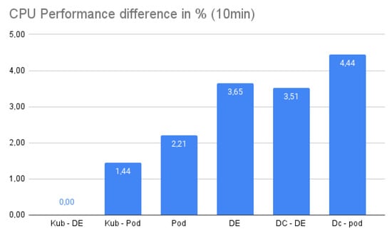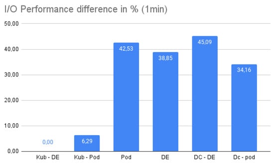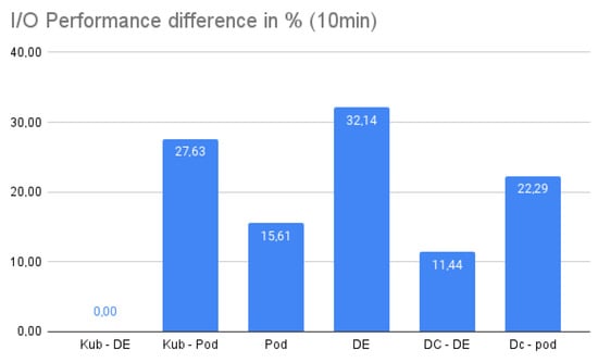 The results for the I/O disk performance graph for ten minutes (see Figure 6) show the same trend as for CPU performance; Kubernetes’ results are still worse than the others, but they significantly increased. This trend supports the hypothesis about the long-term efficiency of Kubernetes.