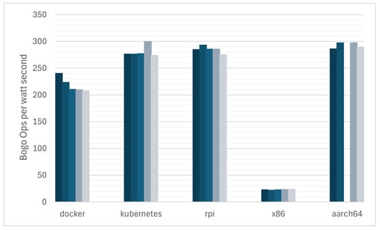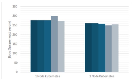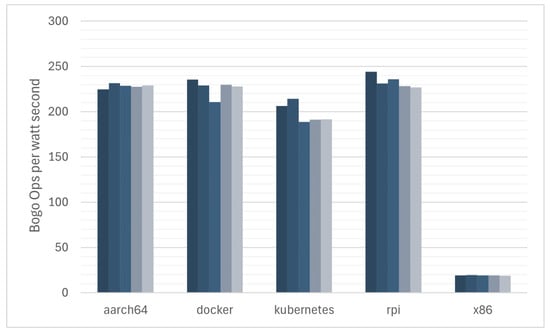 Figure 8 summarizes the whole range of tests performed in the different virtualized and containerized architectures. This figure shows that the use of Kubernetes with the Podman backend demonstrates the advantage of utilizing Kubernetes with the more popular Docker Engine; furthermore, the true extent of x86’s virtualization inefficiency is revealed.
