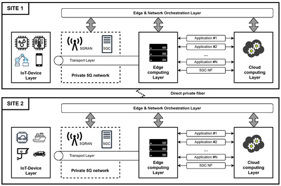 The architecture of the proposed IoT–Edge–Cloud platform, exemplified for two sites, structured into three primary layers: IoT-Device, Edge, and Cloud. This design enables efficient communication and scalability for connected devices. The figure illustrates flexibility in application deployment, showing that applications can operate in either the Edge or Cloud layer or even span both. Each site includes a private 5G network, represented by a dotted square, which provides 5G connectivity to the IoT-Device layer. The Edge and Network Orchestration layer manages resource allocation across both sites, which are interconnected by a direct private fiber link, supporting seamless operation and coordination between the sites.